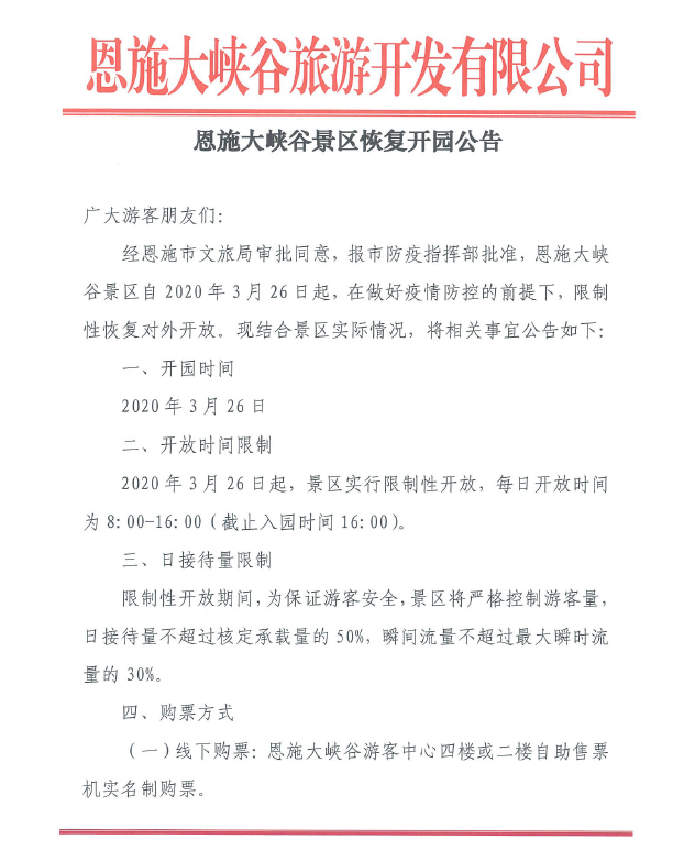 恩施大峡谷旅游开发有限公司今天发布《恩施大峡谷景区恢复开园公告》(以下简称《公告》),2020年3月26日起,恩施大峡谷景区恢复开园。值得注意的是,恩施大峡谷将实行限制性开放,每日开放时间为8:00-16:00(截止入园时间16:00)。